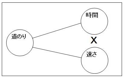 速さを固定値(定数)にした場合、道のりが2倍になれば所要時間も2倍になるので両者は比例します。そこで「道のり」と「時間」とを線で繋ぎます。