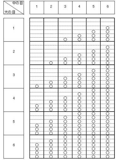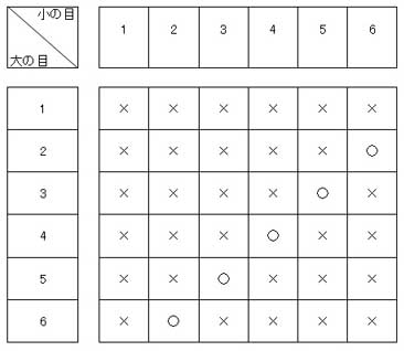 縦と横に要素を分けて配置できるため、樹形図のように大きくなりすぎないという長所を持ちます。 大小2個のさいころを投げて出た目の合計が8に成る確率を求める場合は、方眼表が合います 2個のさいころの様に、分岐が2段の場合は方眼表が威力を発揮します。 慣れる必要がありますが分岐が3段までは、方眼表が使えます。例えば、 大中小3個のさいころを投げ、目の合計が10以上になる確率の場合は、下記の方眼表 が使えます。 大の目と中の目を選ぶとその交点の枠が決まるが、その中がさらに6等分されていて 、その6個が小の目になる