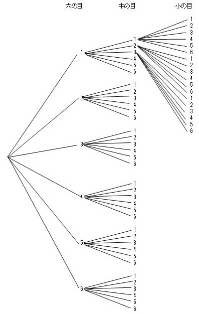 樹形図どのような問題にも対応できる長所を持ちますが、場合の数が多くなると 縦に長くなりすぎるという欠点があります。 例として上記3つのさいころの場合を下に記載します。 用紙が縦に狭いので小の目が書ききれません このような場合は、樹形図で描く実戦向けのコツは、始めの分岐(大の目)は無くし、 2段(中の目と小の目)の分岐を持つ樹形図を横に6個並べる事です。 樹形と言うよりは、幹近くで折った枝を横に6個並べた図の感じです。